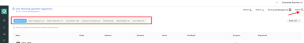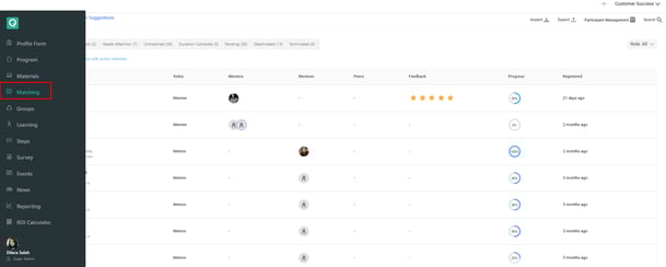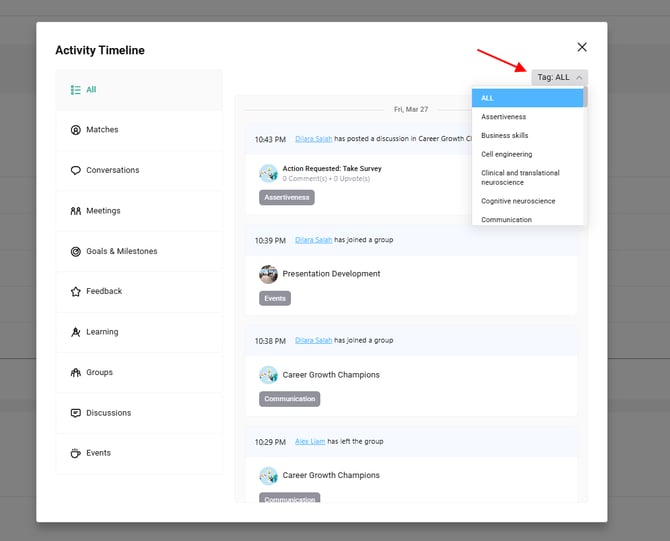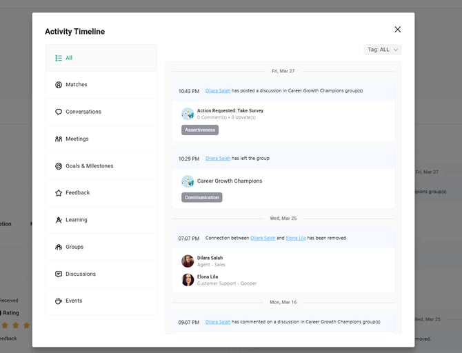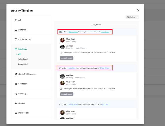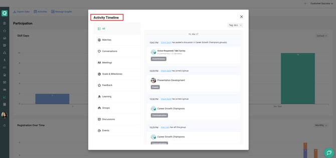 Admins can view participant activity timelines to monitor engagement at both individual and program levels. This includes actions such as meetings, matches, conversations, feedback, and other program interactions.