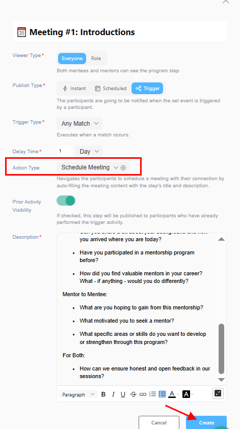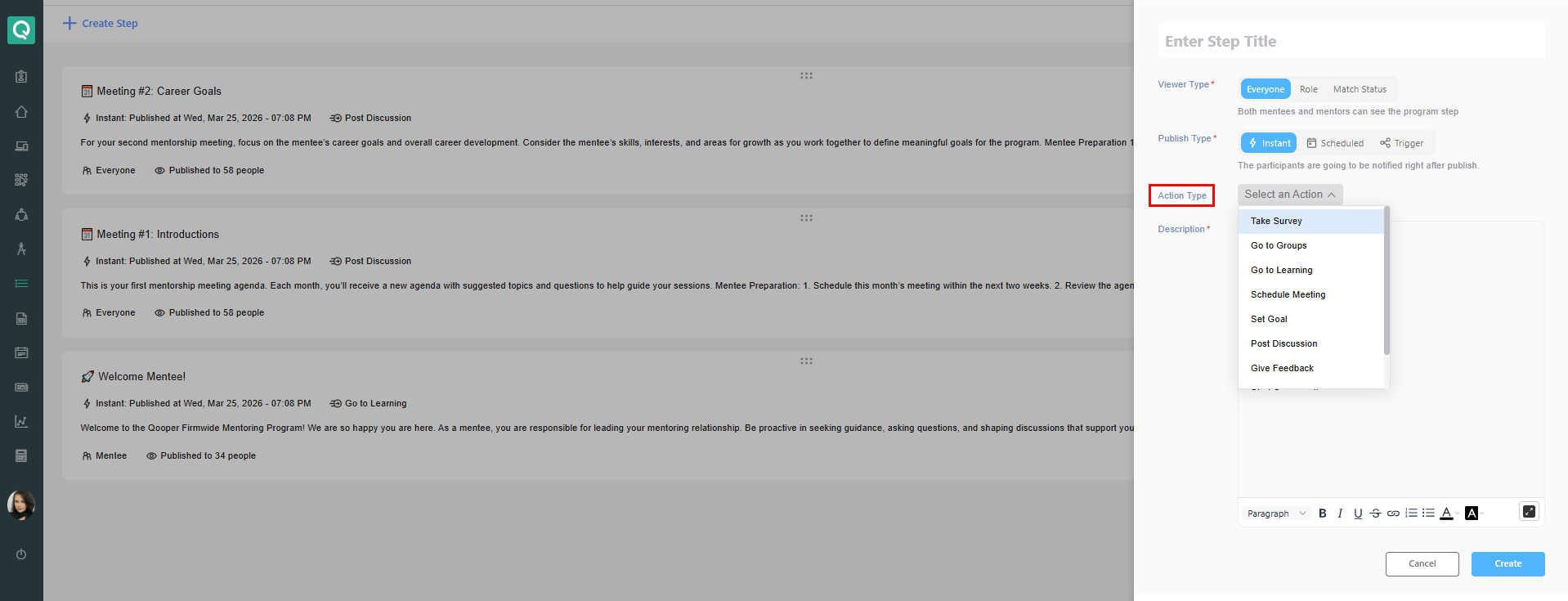 Action Types define what participants are guided to do when they complete a program step. Each action type directs users to a specific feature or activity within the platform.