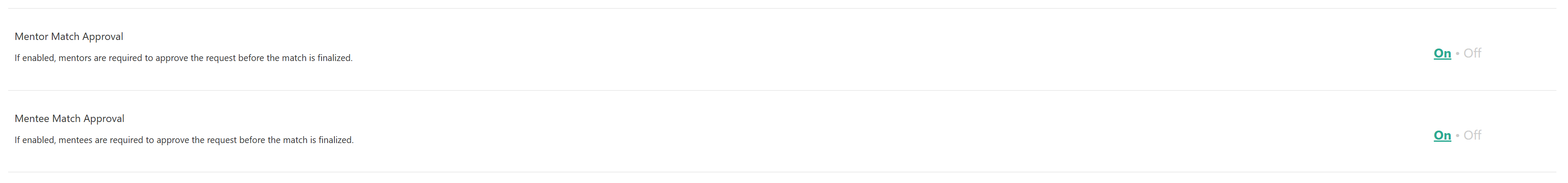 When this setting is enabled, mentors and or mentees are required to approve match requests before a match is finalized. Admins can still review and accept or decline requests at any time.