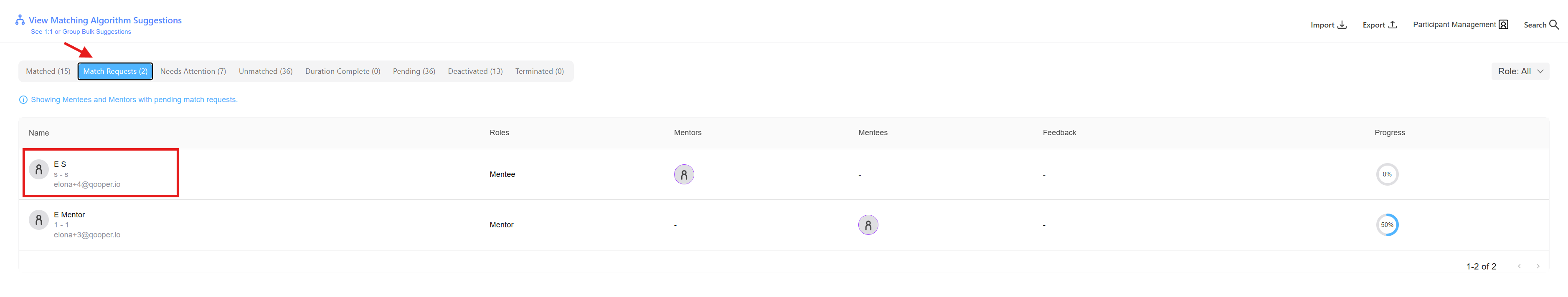 - Match requests appear after participants send requests to each other