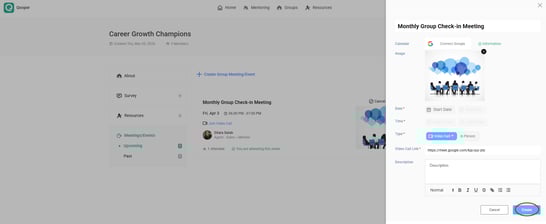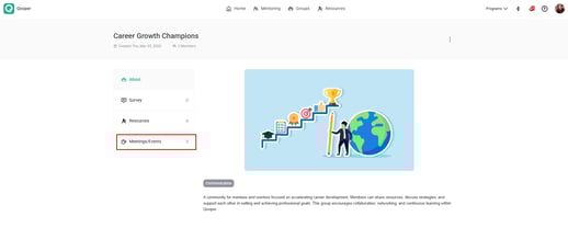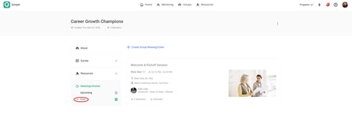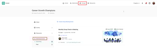 Group meetings must be logged from within the group space, not from individual mentoring connections. The steps are similar to 1:1 meetings but apply at the group level.
