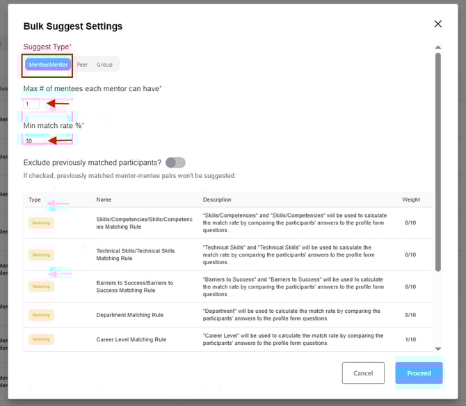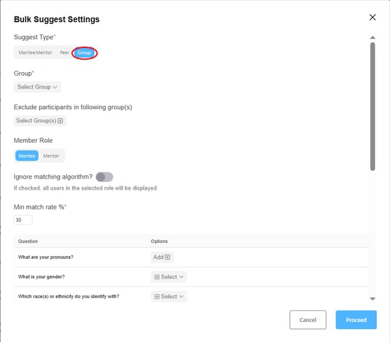This article guides admins on using Bulk Suggest to generate matches in bulk for different program types: Mentor/Mentee, Peer, and Group.