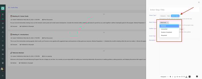 The Viewer Type option in program steps now includes Match Status, which allows admins to control visibility based on a participant’s current mentoring match state.