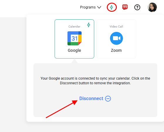 - Disconnect your Google account by following the numbered steps in the image below (First, click on the lightning symbol, then click on Google and click Disconnect)