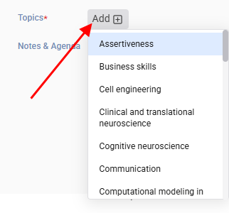 - Pick your meeting topic from the Topics section dropdown menu by clicking on the "+Add" button.
