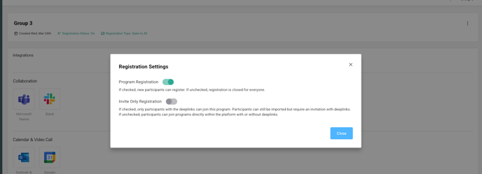 Program management tools make it easier for admins to organize active and archived programs, control registration settings, and maintain the program lifecycle.