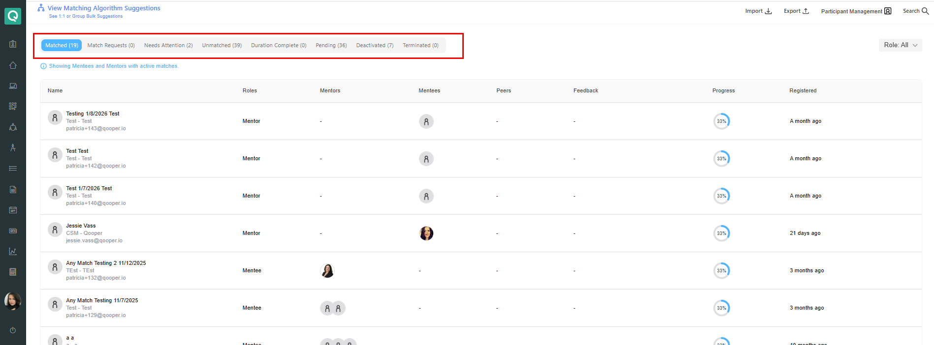 Use these tabs and participant statuses together to easily track progress throughout the mentorship lifecycle from onboarding, to active matching, to program completion.